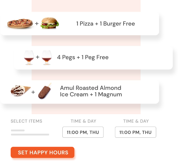 Easily define and apply happy hours offers to your stores / outlet for specific date and times to attract customers and boost sales every week. Our software tracks and compiles these offer sales into customized reports on the menu items sold and what worked best thus helping to understand your customers needs better.